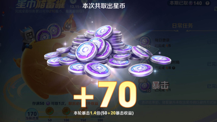 运气好的玩家,如果全程暴击,那就可以拿到420星币,运气最差的玩家,也能够拿到230以上的星币。